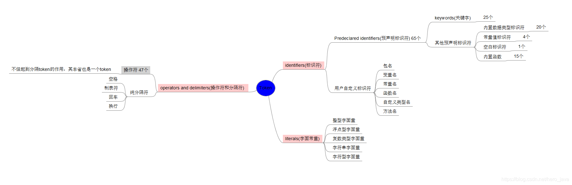 Go语言中的token可以分为 标识符、操作符和分隔符、字面常量。